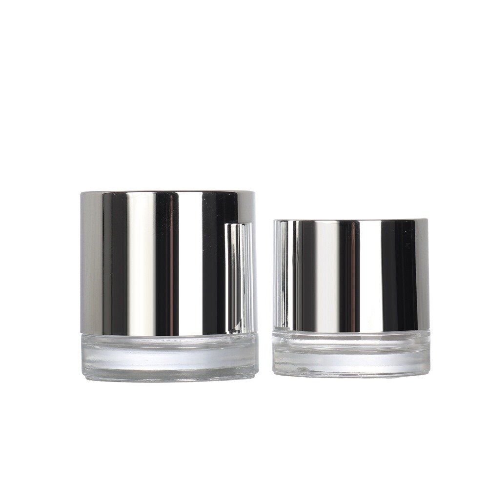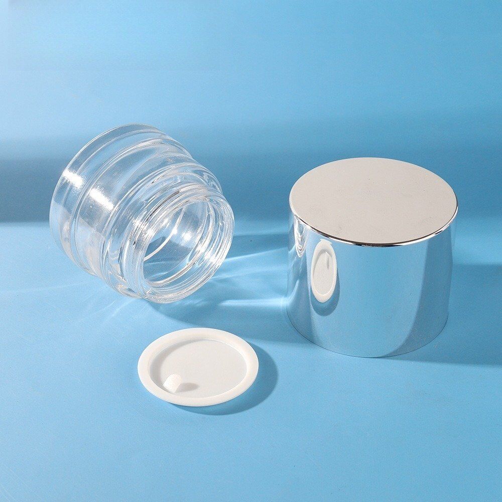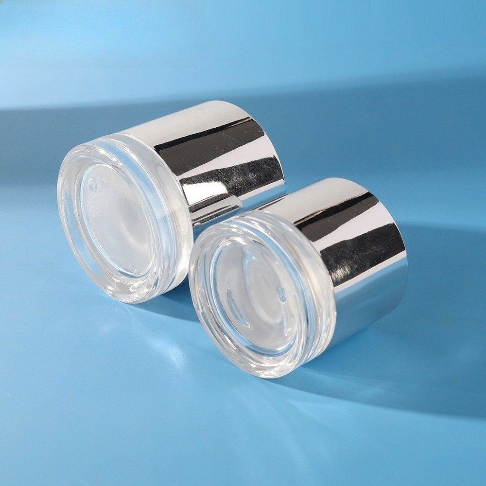 AMQ Packaging premium 50g and 30g glass cream jars feature elegant electroplated silver lids. Perfect for luxury face creams, masks, and cosmetic products. Made from high-quality glass with a wide mouth for easy access. Custom colors and logo printing available. Ready for fast shipping to meet your production needs.
