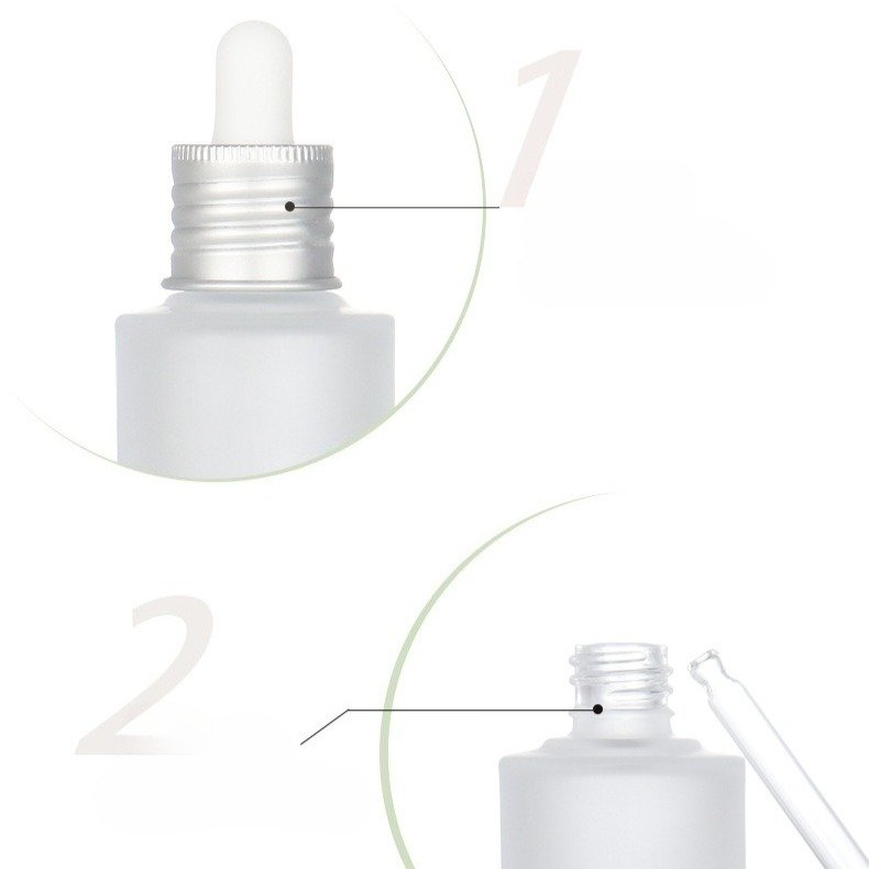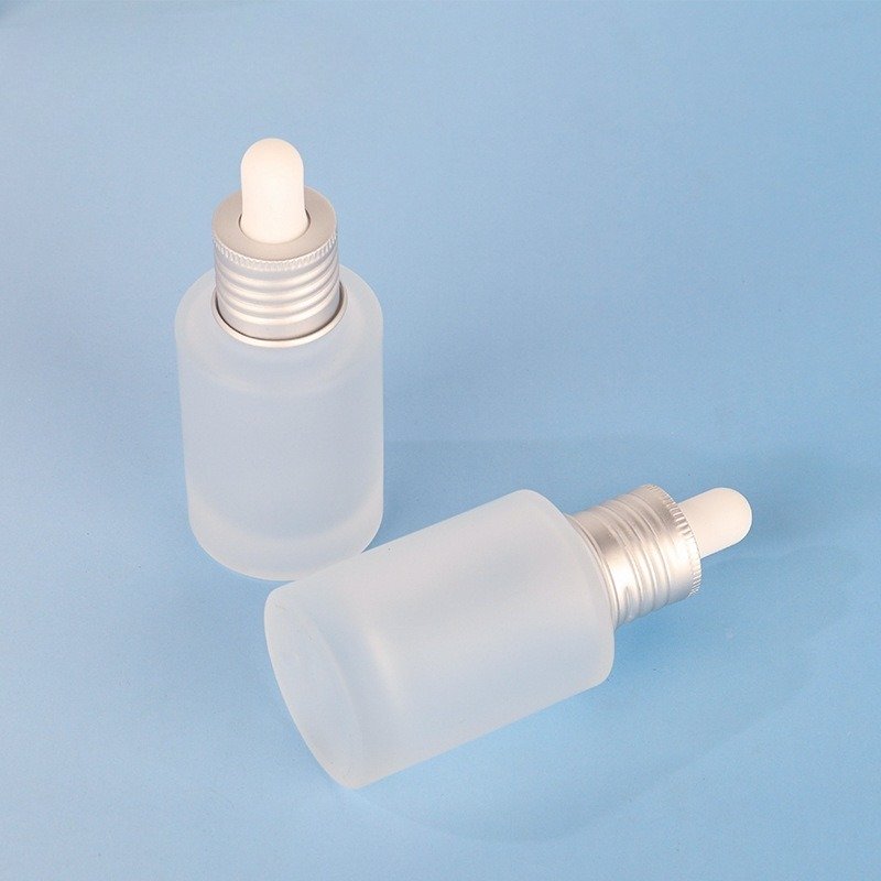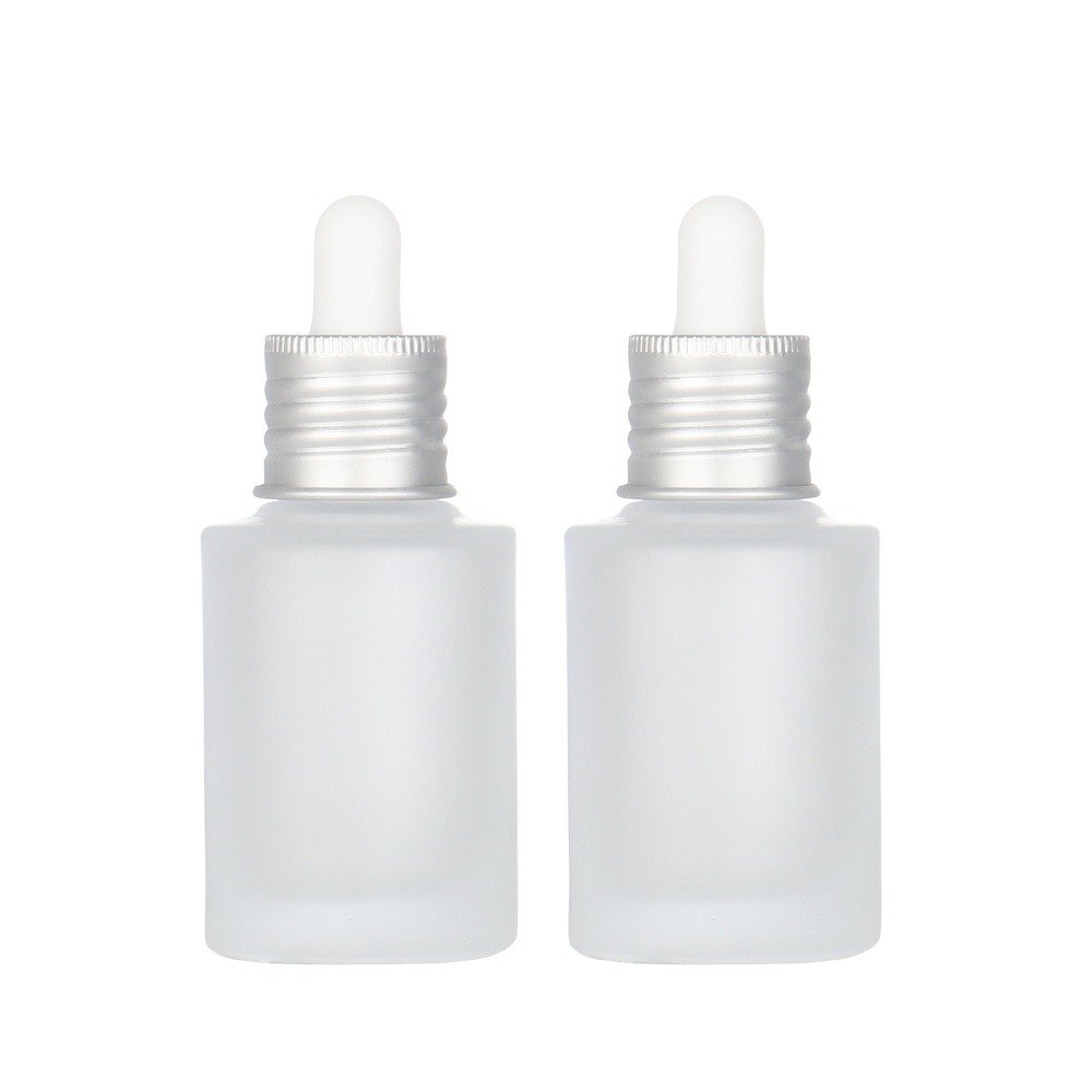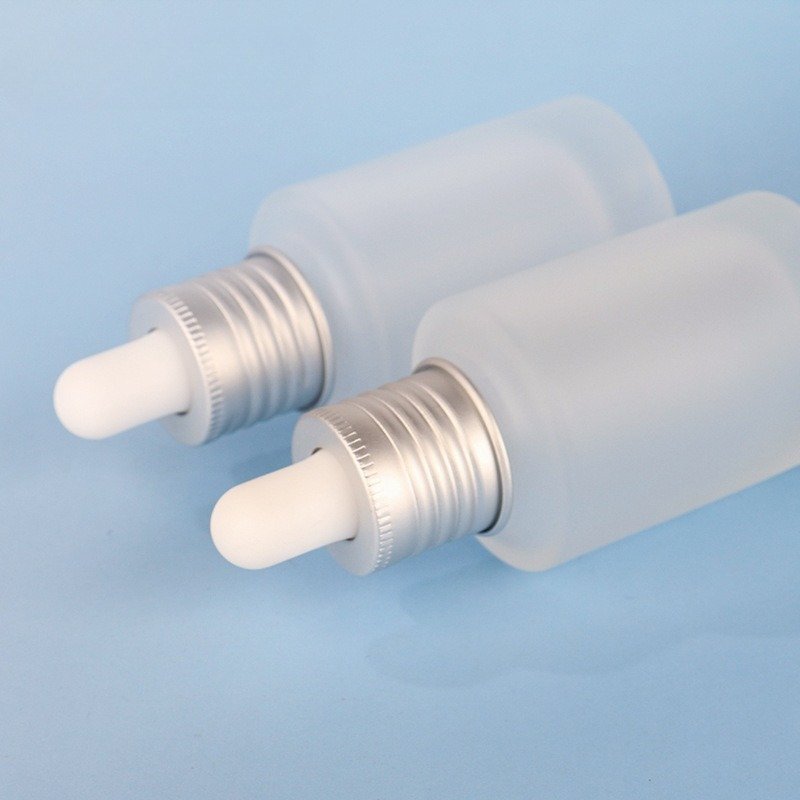 This 30ml frosted glass dropper bottle is perfect for serums and oils. It features a matte silver ring and white pipette. All parts are customizable. We leak-test every bottle. MOQ 3,000. Fast shipping: 10-15 days (7-day express available). Reliable quality for your brand.