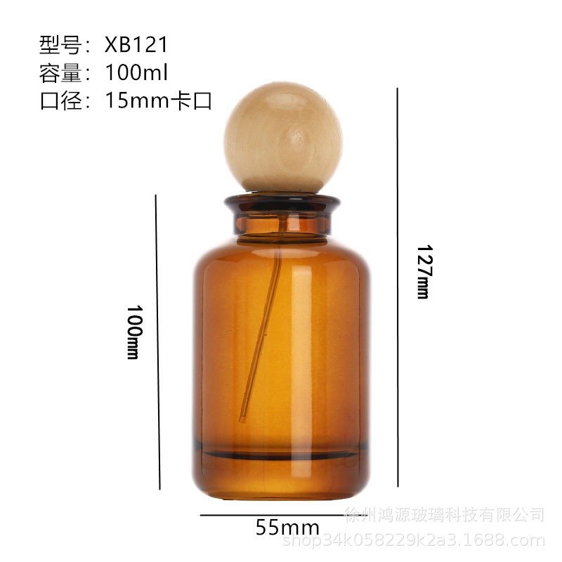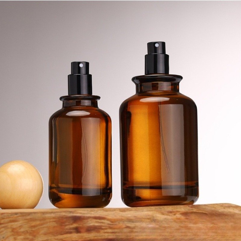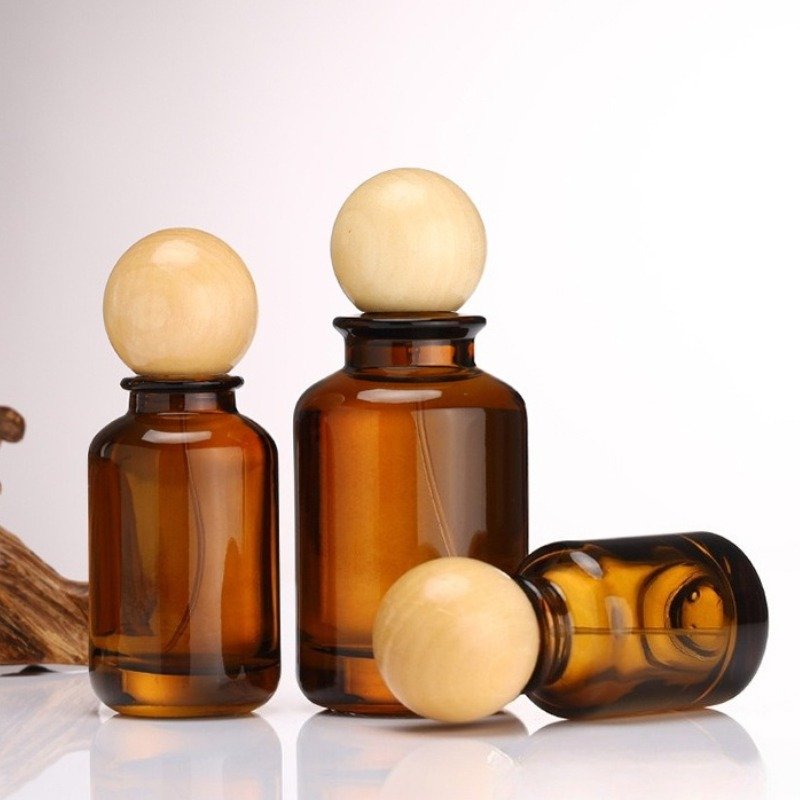 *Amber glass spray bottle, 100ml perfume decanter, refillable fragrance bottle, wooden cap cosmetic packaging, customizable spray pump, UV-protective bottle, wholesale essential oil bottles.*