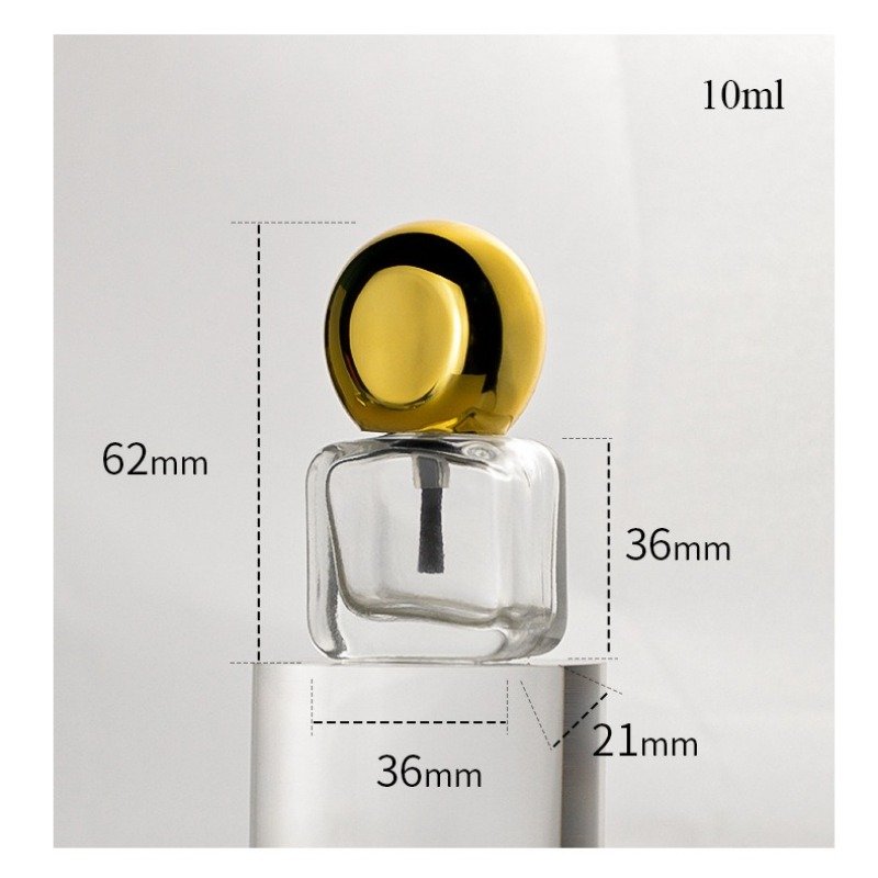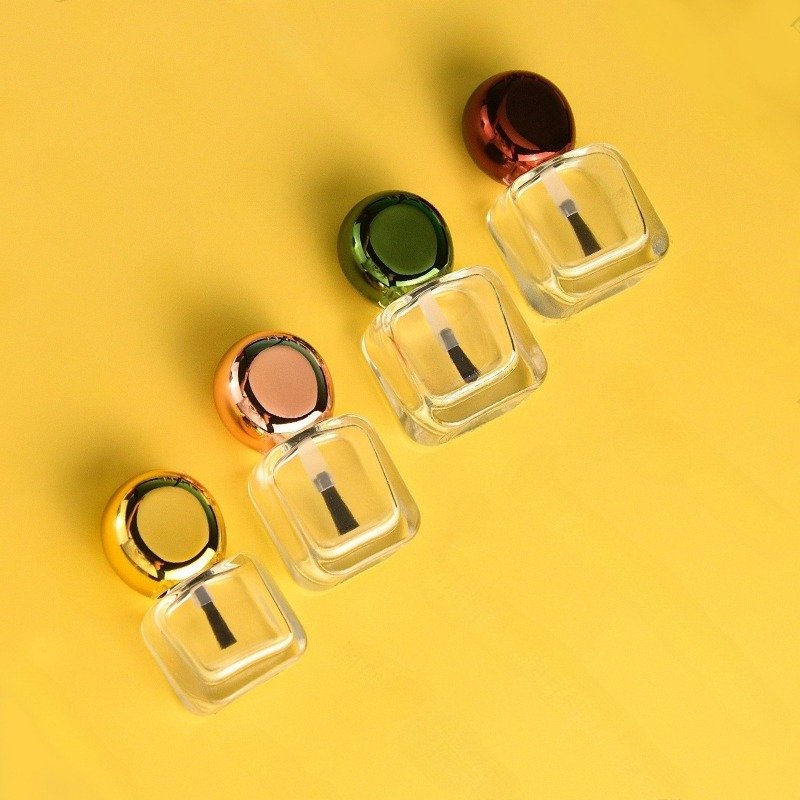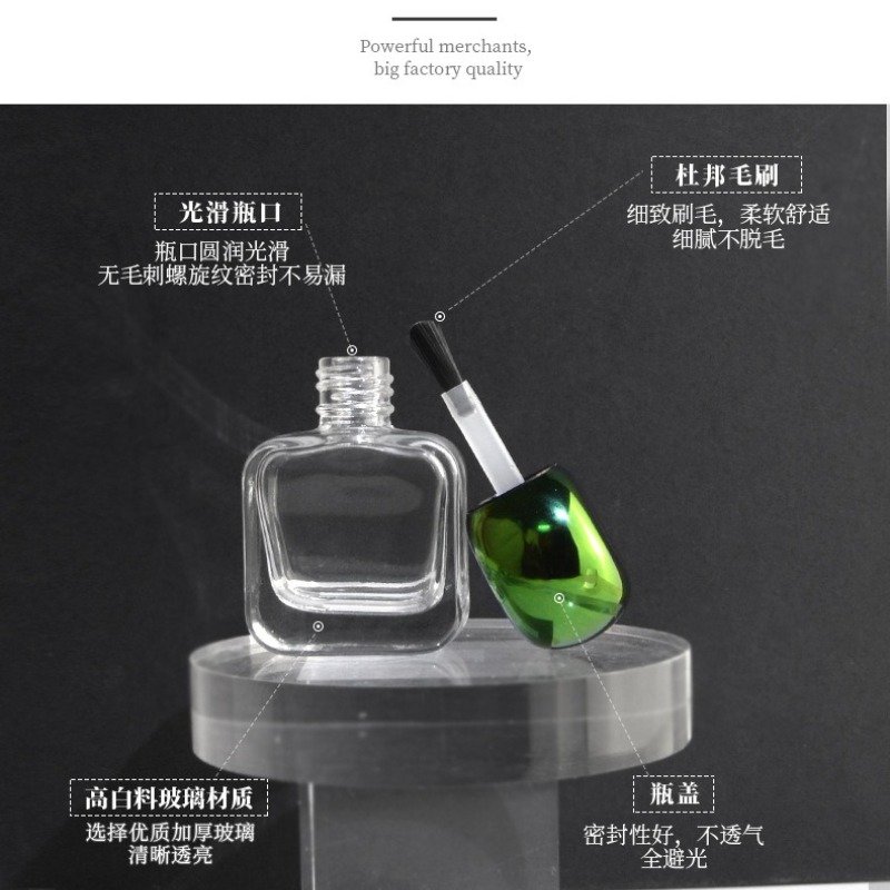 Unique square 10ml nail bottles with 13-thread necks. Custom bottle/cap colors. MOQ 10,000. Ships in 2 weeks. Matte/glossy/electroplated options. Perfect for professional polish brands. Free samples available. Global delivery.