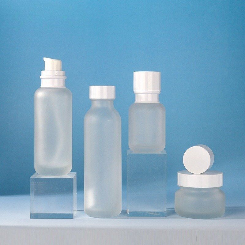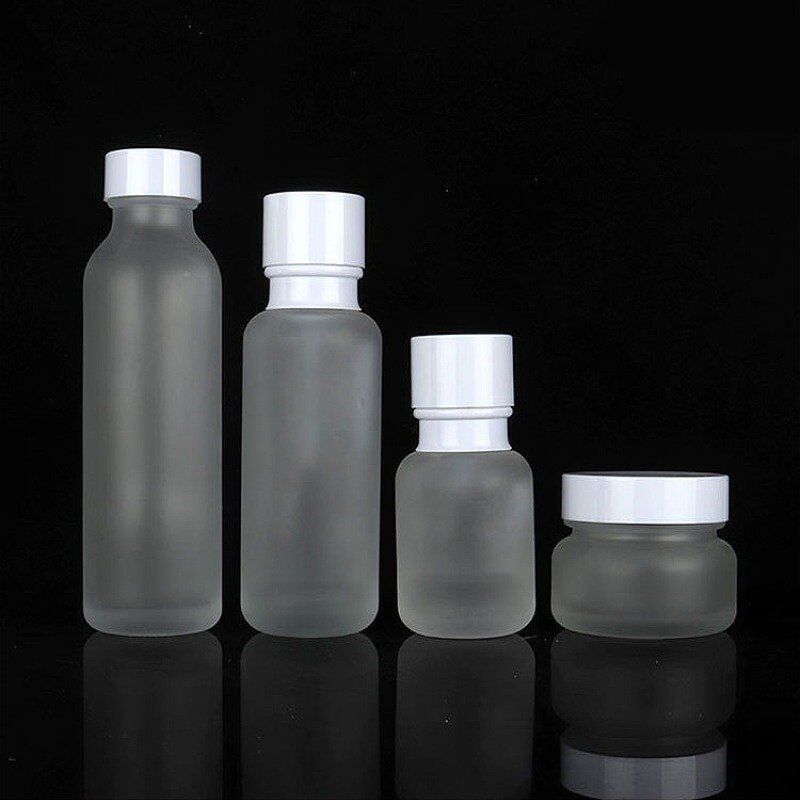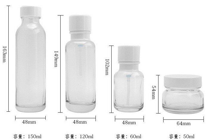 Premium cosmetic set glass packaging includes 50g cream jar, 50ml, 120ml pump bottle, 150ml screw bottles. Ideal for skincare & cosmetics, ensuring luxury, durability & eco-friendly appeal. Perfect for serums, lotions & creams.