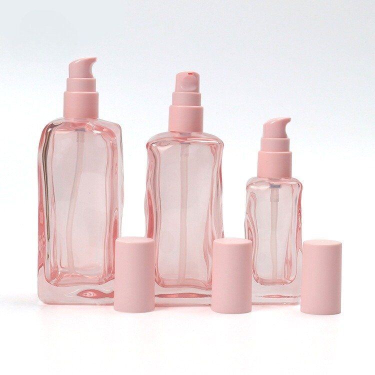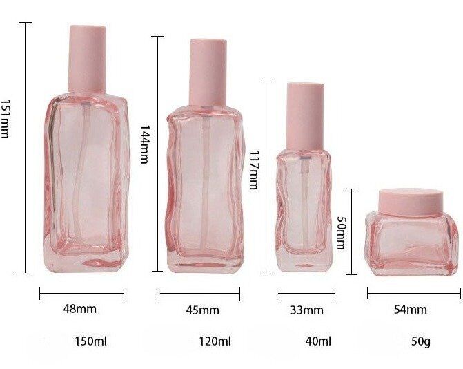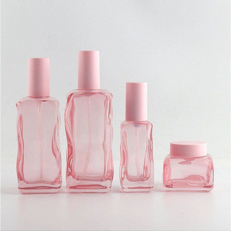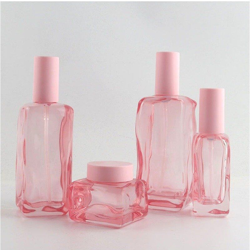 This elegant beautiful unique uneven surface square glass bottles is very hot sale. The size is 150ml, 120ml, 40ml with pink pump head, 50g cream jar. The most special part is the uneven surface of the packaging, which makes it outstanding from other normal design.