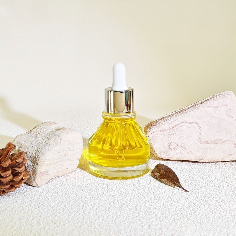 Elegant 30ml pagoda-shaped glass bottle with intricate patterns and slanted shoulder design. Features glass dropper for precise dispensing. Perfect for essential oils and luxury serums. Custom branding available. Ideal for brands seeking distinctive, high-end packaging.
