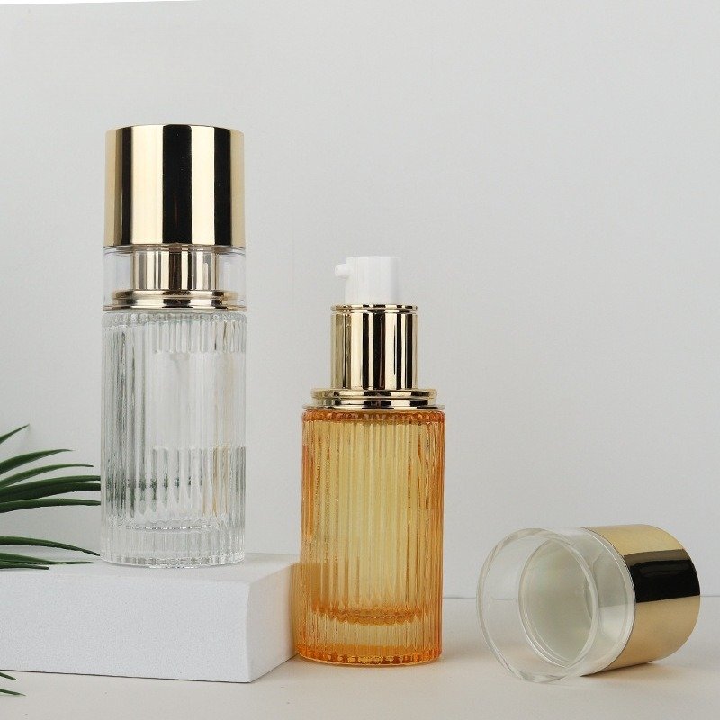 AMQ Pack luxury gold pump and cap with 30ml pump glass bottle is the ideal packaging for luxury skincare serums, facial oils, and liquid foundations. Featuring an airless pump mechanism, it protects sensitive formulas from oxidation and contamination while ensuring precise, mess-free dispensing.