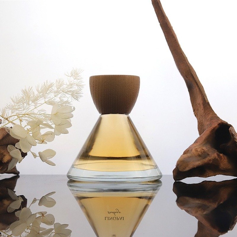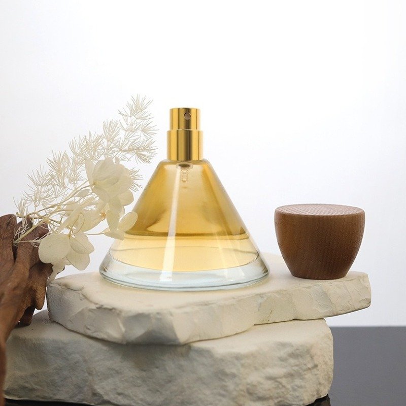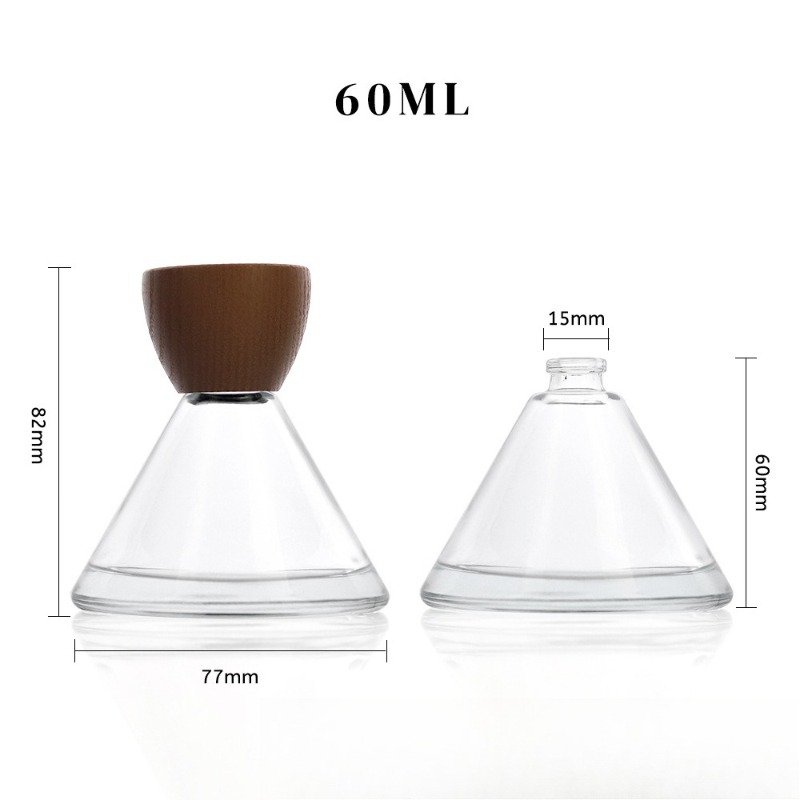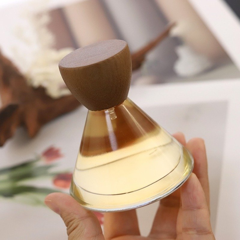 Introducing our new 50ml inverted cone-shaped perfume bottle with a luxurious wood lid and thick glass base. This premium spray bottle features an elegant pagoda design and can be customized with various colors and finishes like frosted, metallic, or gradient effects. Perfect for luxury fragrance brands seeking distinctive packaging.