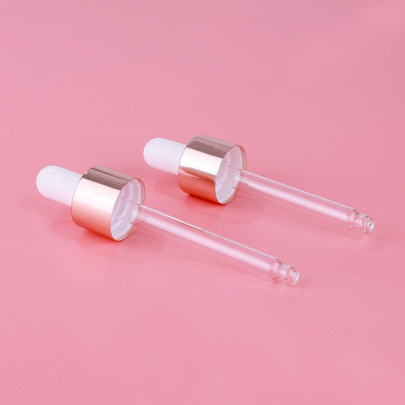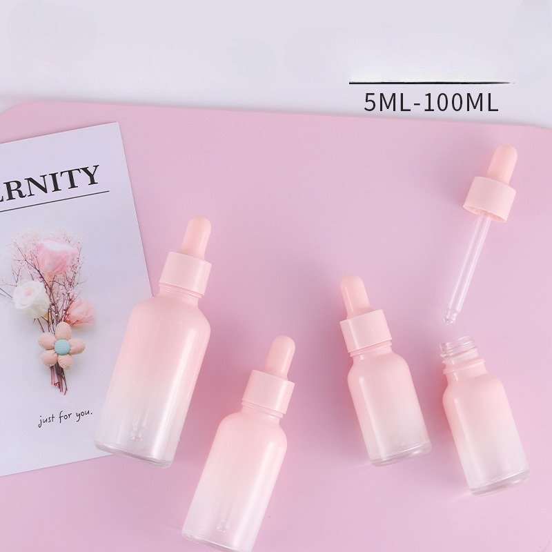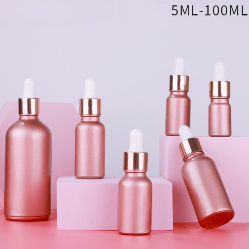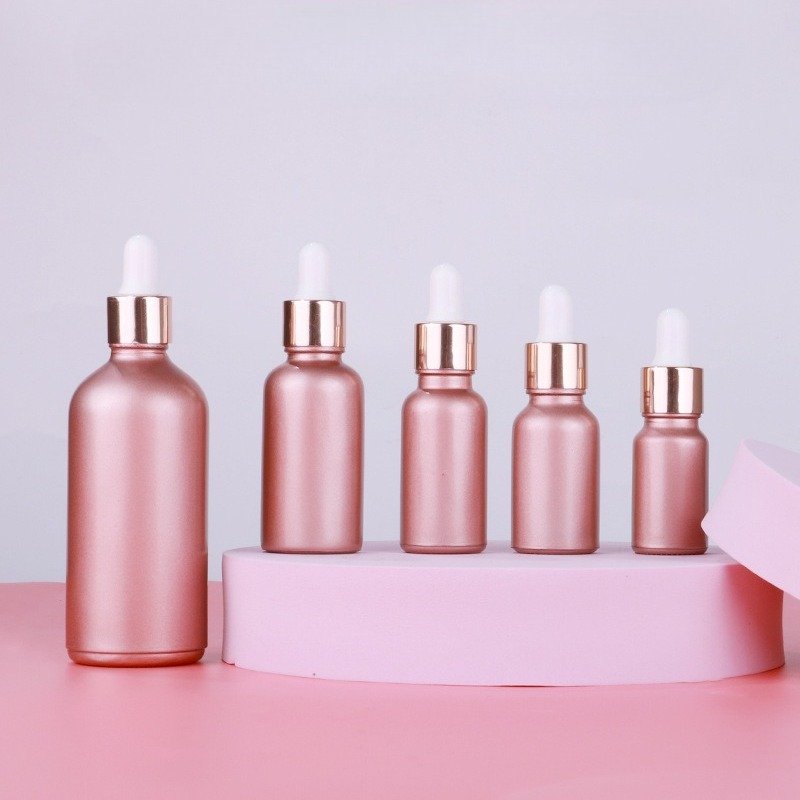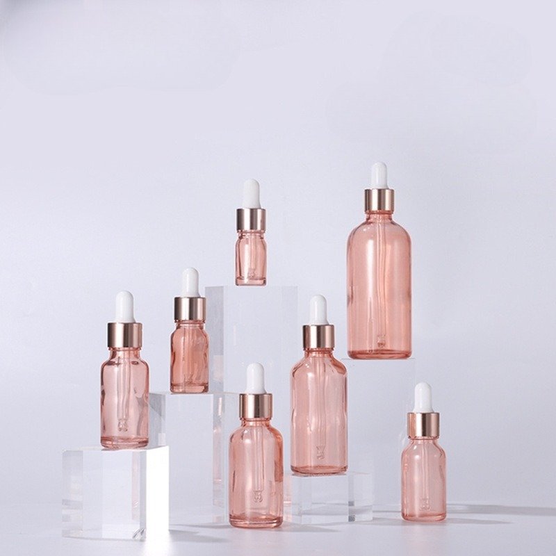 Wholesale 5ml-100ml rose gold & pink glass dropper bottles for serums, oils & skincare. Custom colors & logos. Perfect for skincare and cosmetic packaging.